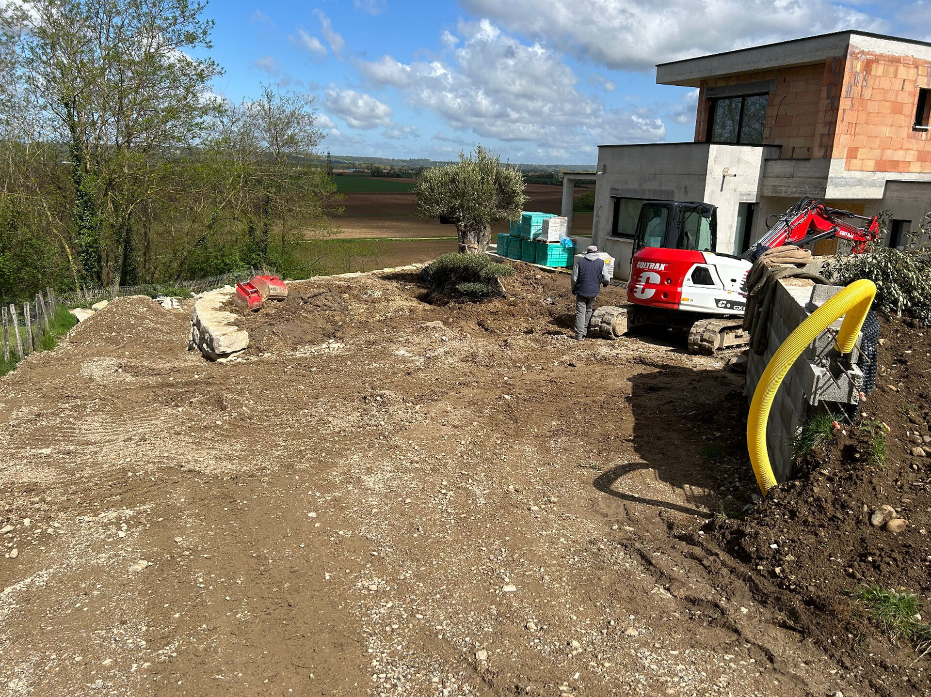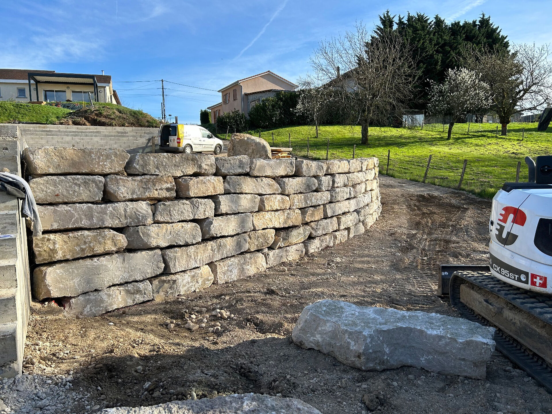 Le projet a consisté en un terrassement complet, accompagné de la mise en place d’un enrochement paysager. Cette intervention a permis d’assurer à la fois la stabilité du terrain et une intégration harmonieuse dans l’environnement naturel, respectant le paysage et les contraintes du site.